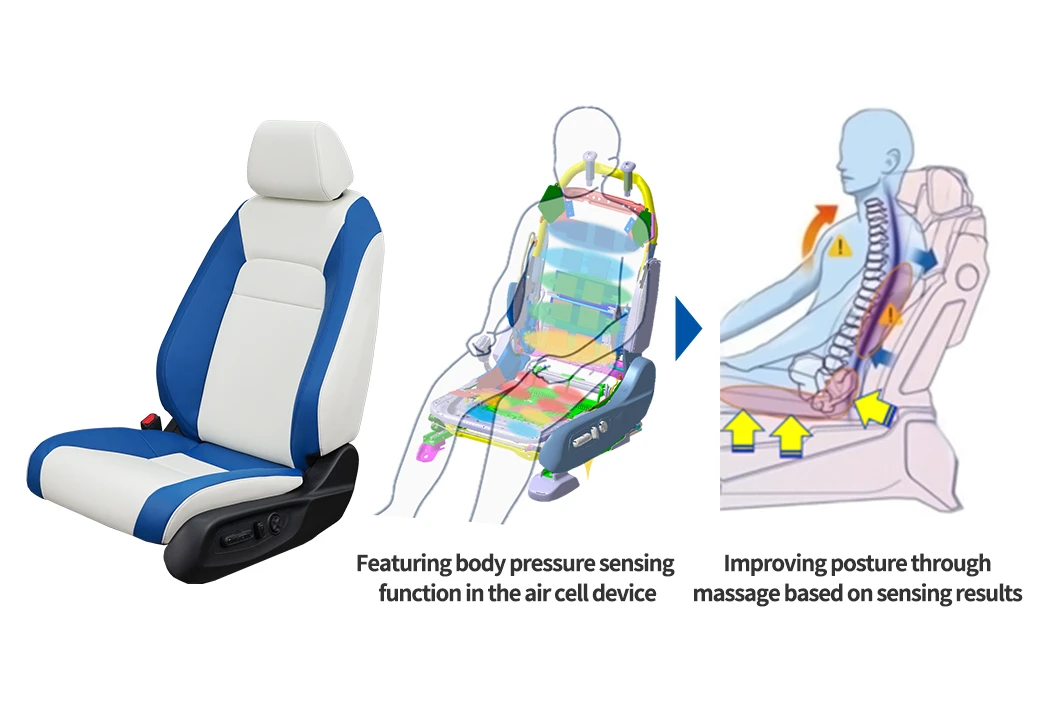 This seat features a body pressure sensing function in the air cell device to support care for the lower back by improving posture through massage based on sensing results. The seat also incorporates a wide range of other healthcare elements to meet user needs. Examples include the sports warmup mode to massage muscles to suit various sports activities and femtech features that harness warmth and pelvic relaxation to ease menstrual and other pain experienced by women.