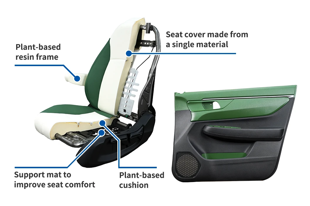 Use of a single material for decoration parts of door trim enables recycling without segregating materials. By switching from petroleum-based to plant-based materials, the seat and door trim also help reduce product CO2 emissions.