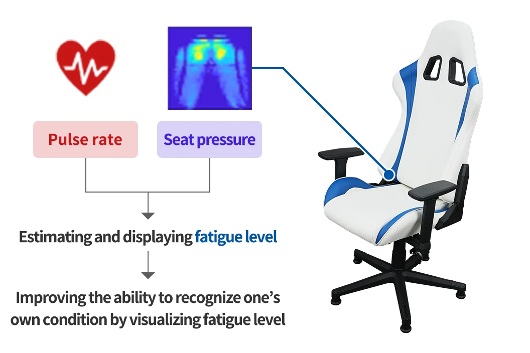 We developed an algorithm that estimates fatigue based on smart watch pulse rate data and data transmitted by seat pressure sensors. Feasibility testing is currently underway for use in e-sports, with the goal of improving performance by allowing e-sport competitors to visualize their level of fatigue. In the future, to promote safer driving, we plan to extend this technology to automobiles.