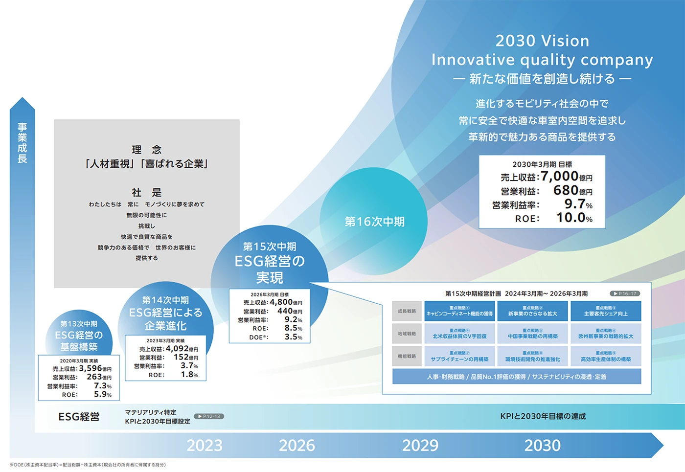 2030年ビジョン達成に向けたさらなる成長を果たすべく「成長戦略」「地域戦略」「機能戦略」からなる9つの重点戦略に取り組んでいきます。また、第13次中期から取り組んできたESG経営の集大成とすべく持続可能な社会へ貢献し、全てのステークホルダーの皆さまから存在を期待され「喜ばれる企業」となることを目指します。