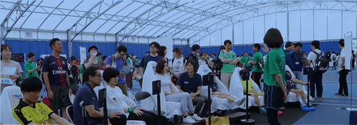 その一例が「ゆるスポーツランド2019」にてお披露目した「緩急走(かんきゅうそう)」。「緩急走」は世界ゆるスポーツ協会とコラボした“ゆるスポーツ”の一つで、座った人の動きを検知してバーチャルプレイヤーが連動して走ります。開発に当たっては、誰もが楽しめることを目指し、車イスチャレンジユニット「BEYOND GIRLS」に何度もトライアルしていただき、「座ったままでもスポーツを楽しめるか?」「車イスの彼女たちが体育会系の健常者男性と競技して勝てるか?」などのチェックポイントをつくりながら共創しました。